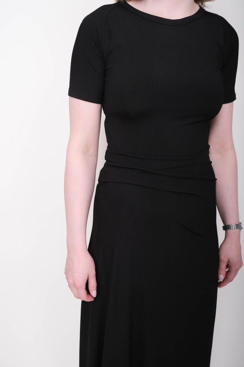 Tyköistuva yläosa ja vyötärön rypytys luovat naisellisen siluetin, kun taas kevyesti levenevä midipituinen helma tuo lookiin rentoa ilmavuutta.
