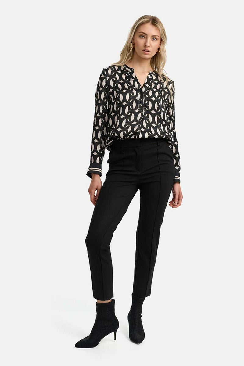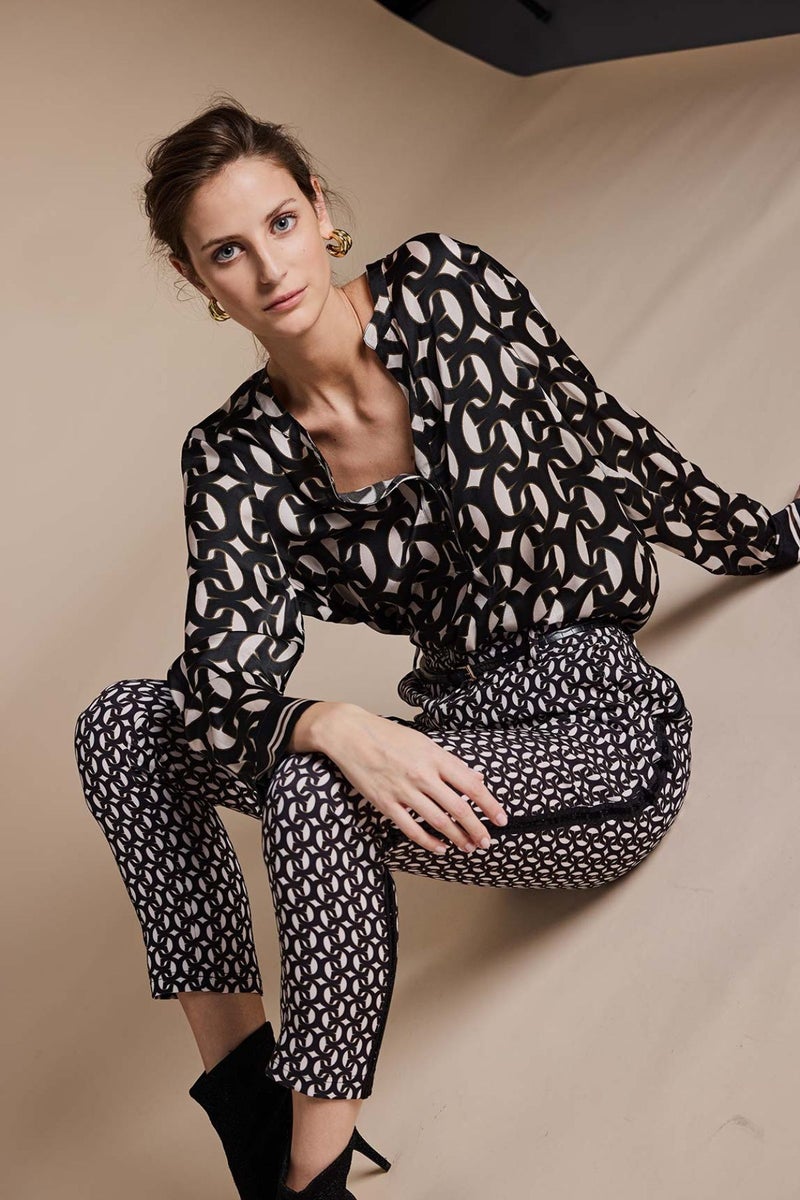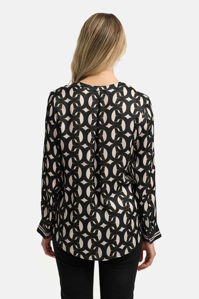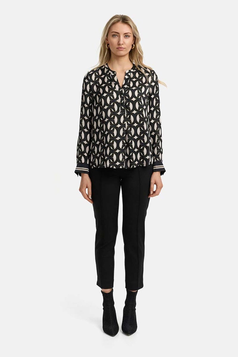 Catnoirin kuviollinen pusero on valmistettu sileästä ja liukkaasta viskoosista, jossa on kaunis satiinimainen kiilto. Puserossa on pitkät hihat leveillä kalvosimilla, naisellinen v-pääntie nappikiinnityksellä ja pienet sivuhalkiot helmassa.