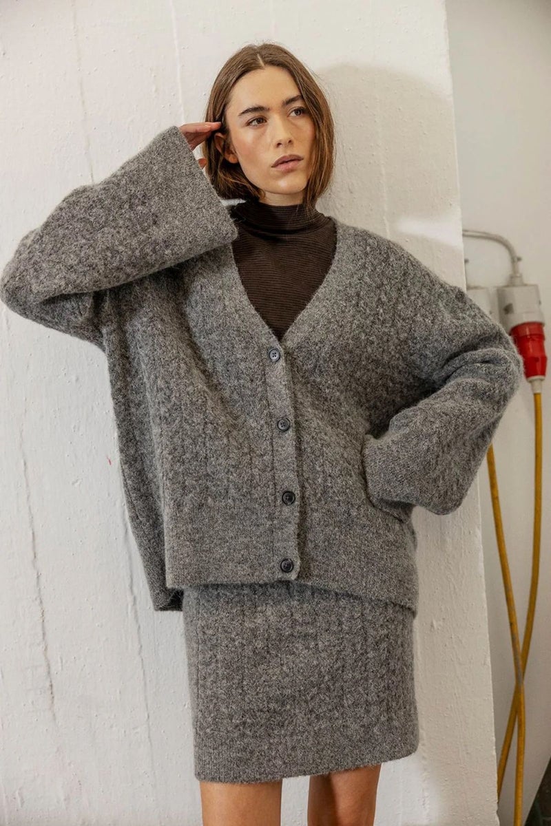 Project AJ117 Carola Mini Skirt on ribbipintainen minihame, jonka kaunis palmikkokuvioitu pinta ja pehmeä tekstuuri tuovat asuun ripauksen ylellisyyttä. Minihame on valmistettu laadukkaasta alpakkasekoitteesta, jossa on mukana hieman joustoa.