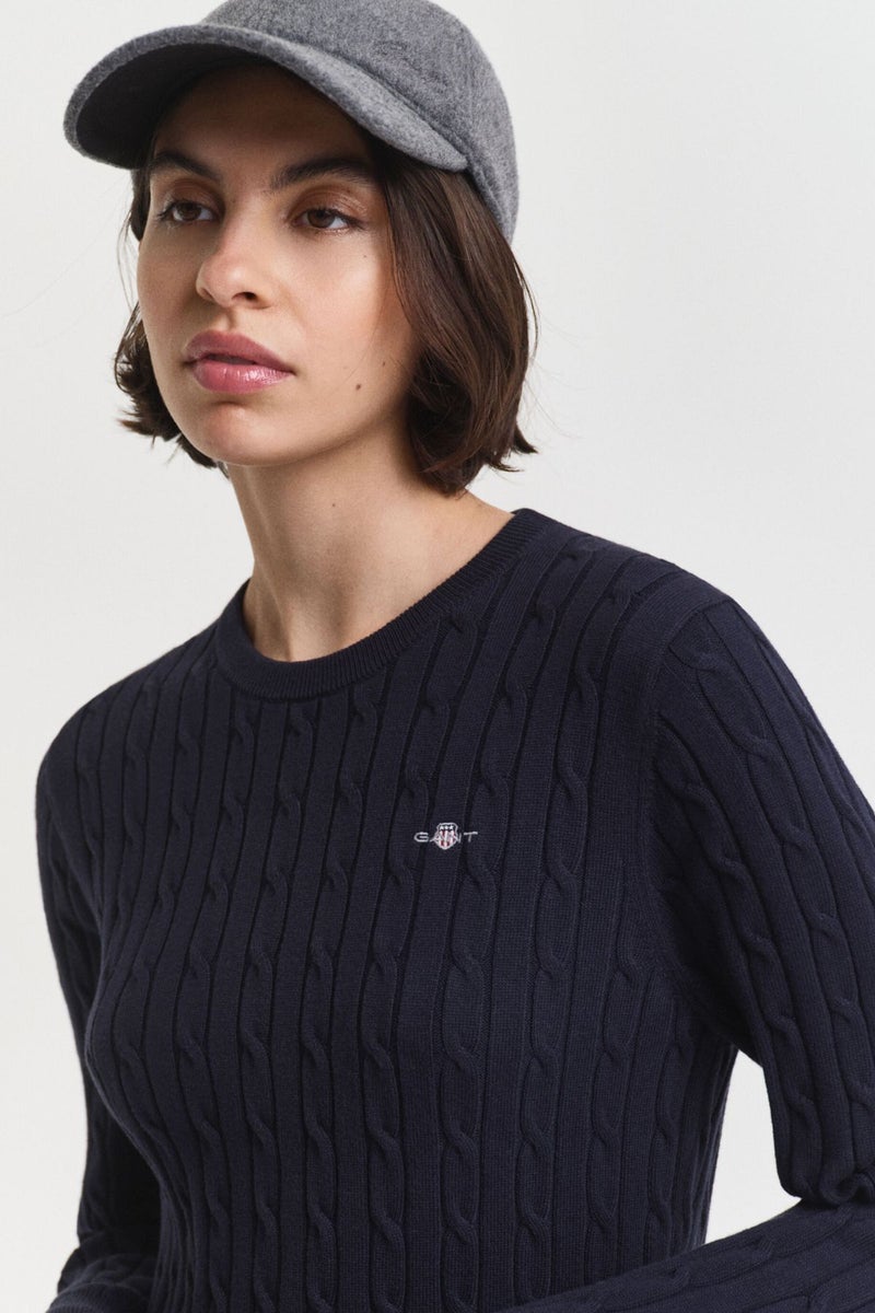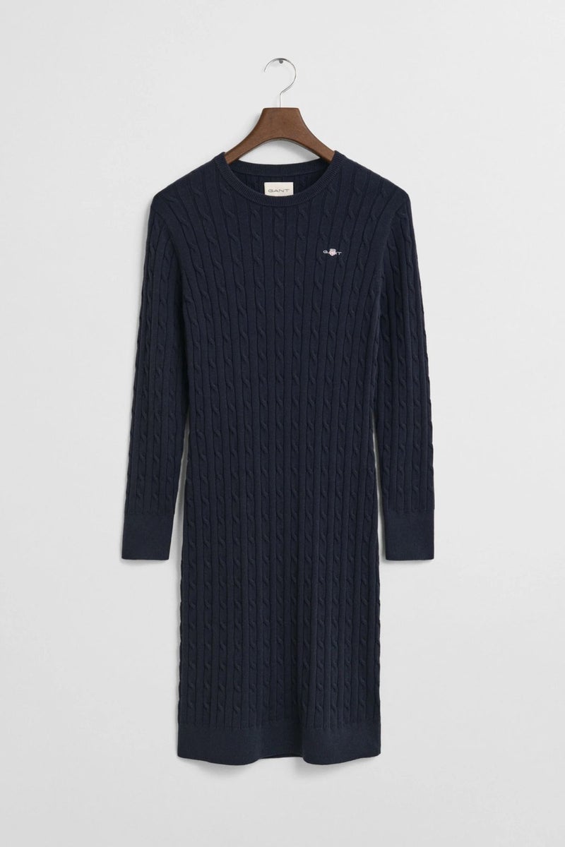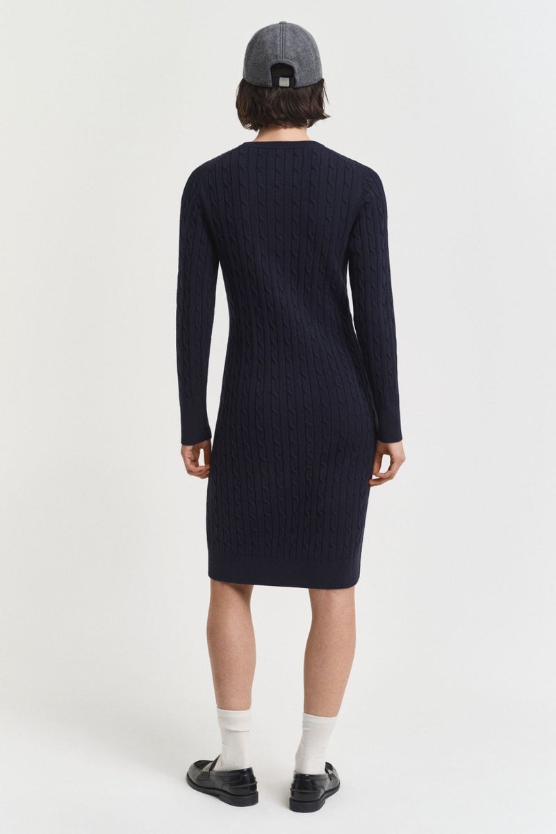 GANT tummansininen palmikkoneulemekko on ehdoton valinta kylmiin vuodenaikoihin. Hieman polven alapuolelle ulottuvassa mekossa on kapea mitoitus, klassinen pyöreä pääntie, joustinneulotut reunat pääntiessä, helmassa ja hihansuissa sekä GANT Archive Shield ‑kirjailu rinnassa.