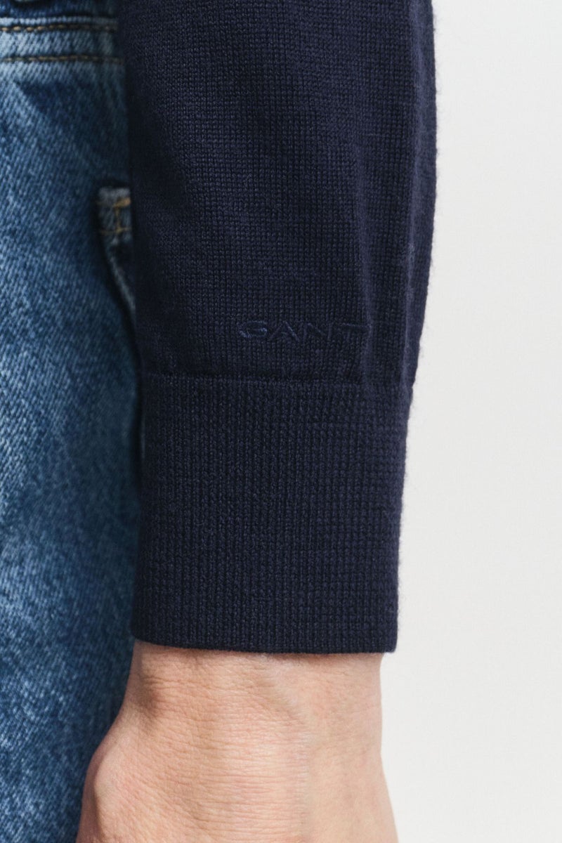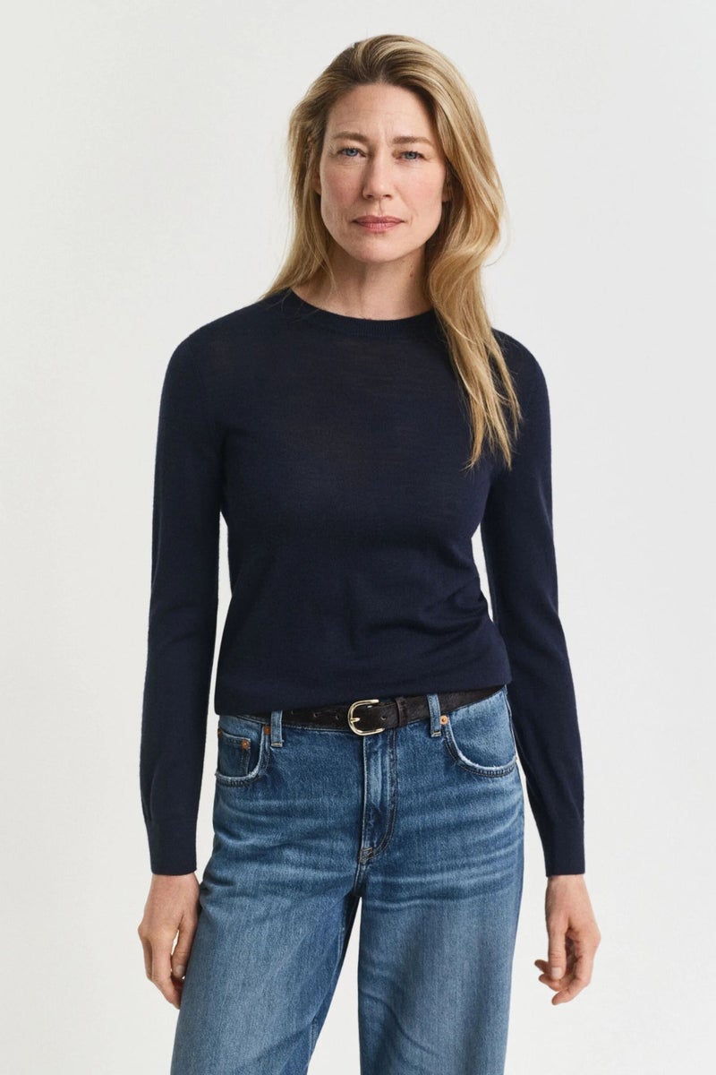 Gantin kevyt neulepusero on valmistettu erittäin hienosta, ohuesta ja pehmeästä merinovillasta. Sileästä neuloksesta valmistetussa puserossa on normaali mitoitus, klassinen pyöreä pääntie, joustinneuletta pääntiessä, helmassa ja hihansuissa sekä kirjailtu GANT-logo hihansuun yläpuolella.