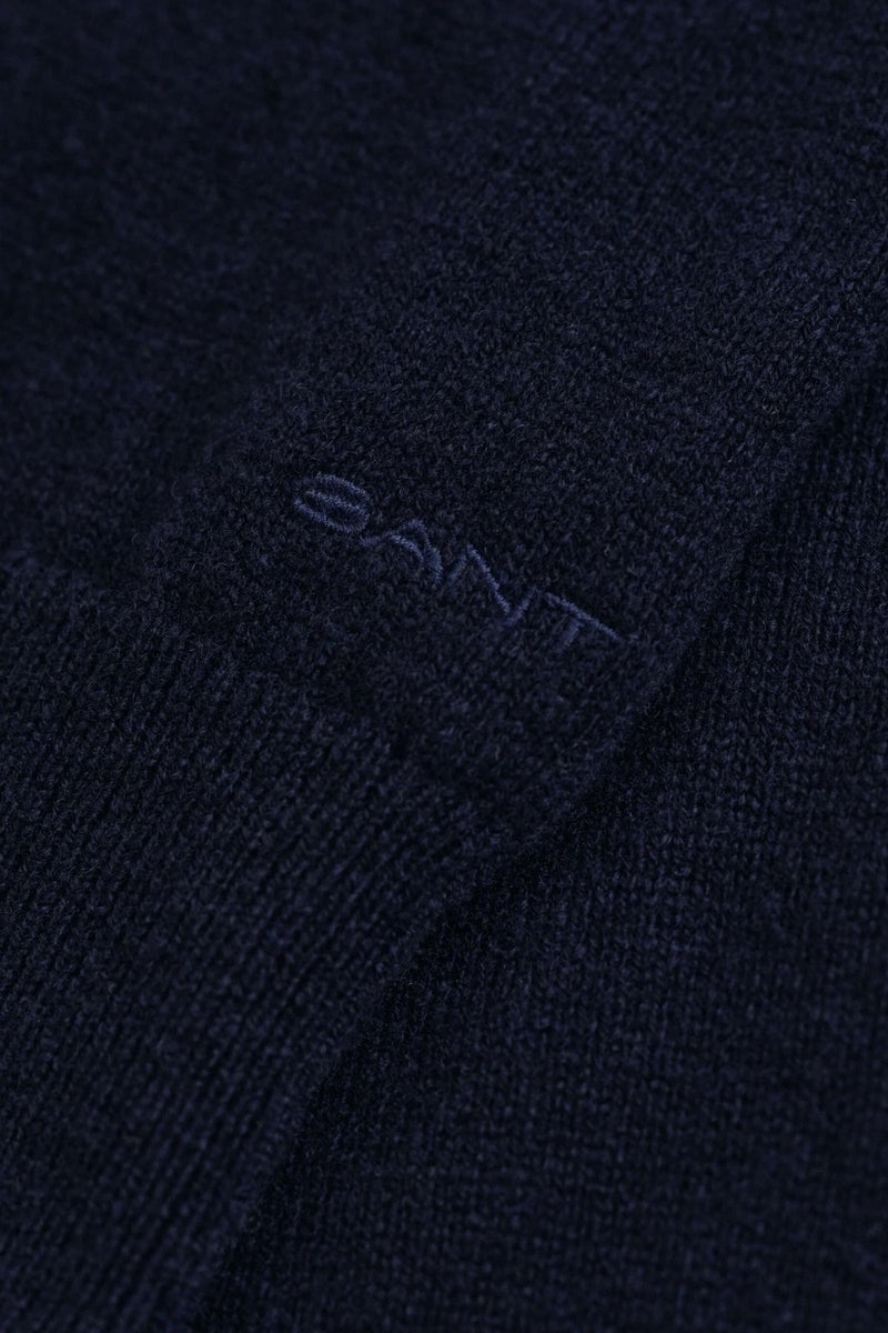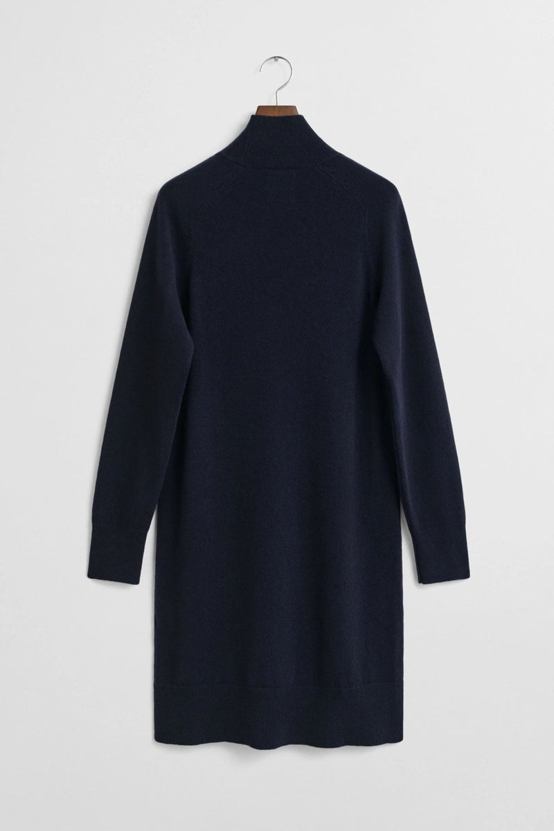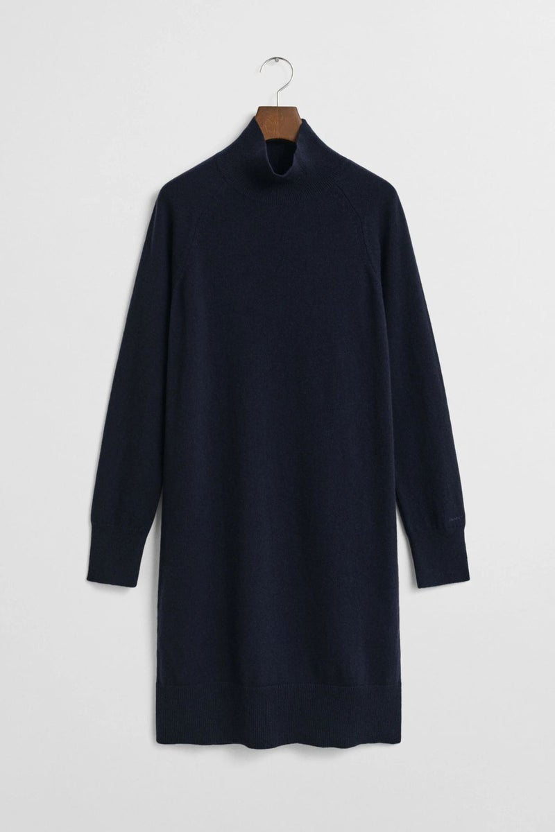 Gantin tummansininen neulemekko on valmistettu erittäin hienosta italialaisesta karitsanvillasta, ja sen helma ulottuu hieman polven alapuolelle. Neulemekossa on poolokaulus ja satulahihat, joustinneulotut reunat pääntiessä, helmassa ja hihansuissa sekä kirjailtu GANT-logo hihassa.