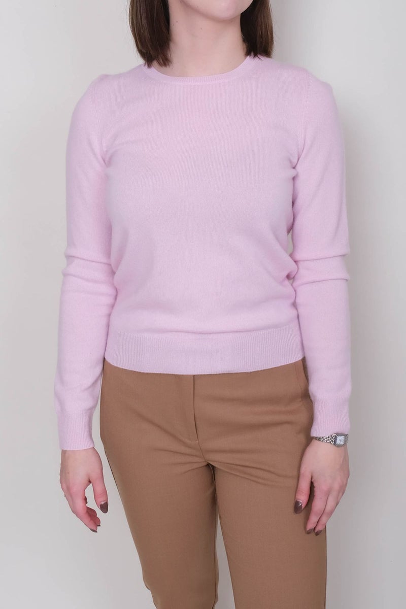 Repeatin vaaleanpunaisessa kashmirneuleessa on pyöreä pääntie, pitkät hihat ja hillitysti istuva, suora malli. Kevyt ja hienoneuloksinen pinta tekee neuleesta täydellisen yhdistettäväksi housujen ja hameiden pariksi.