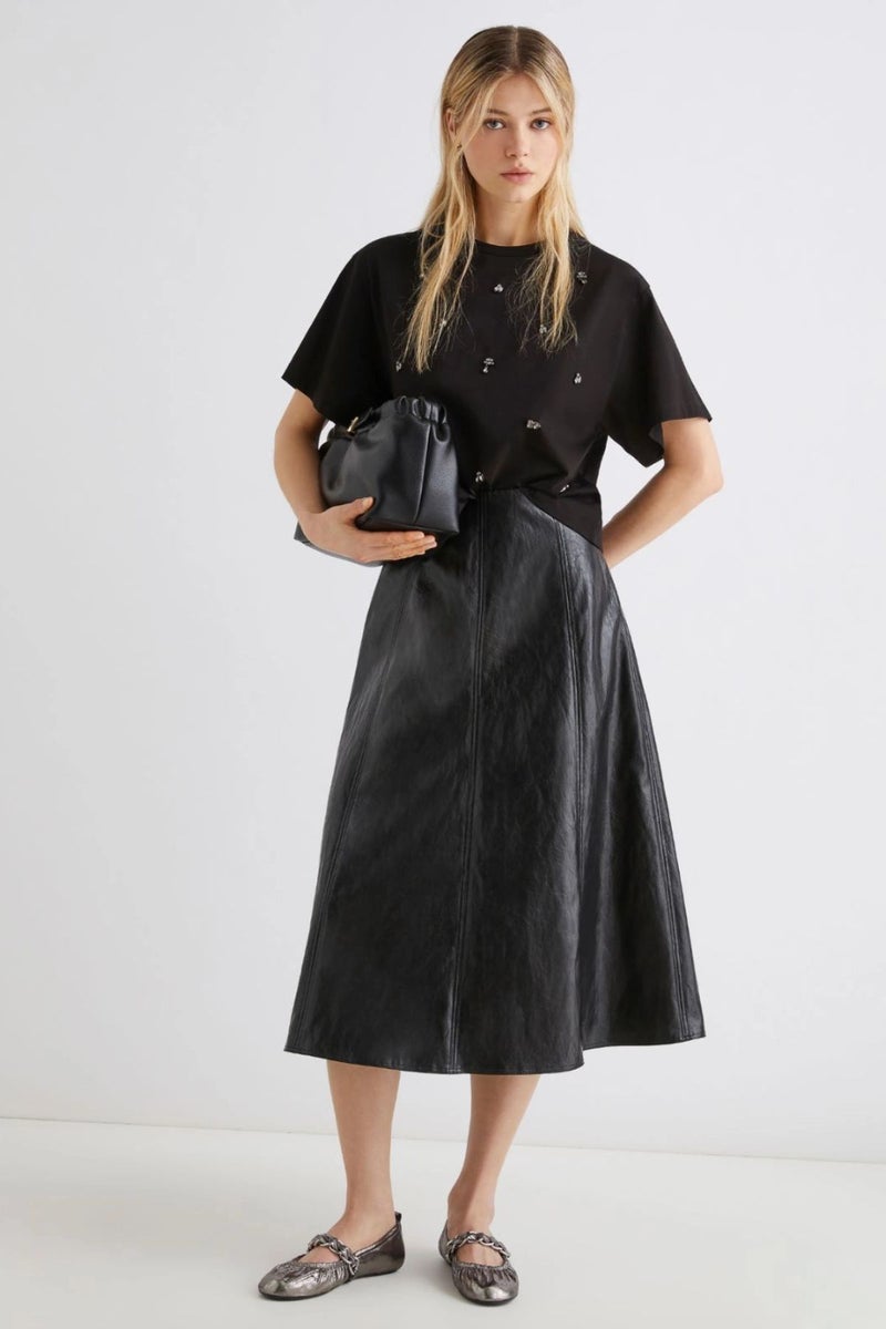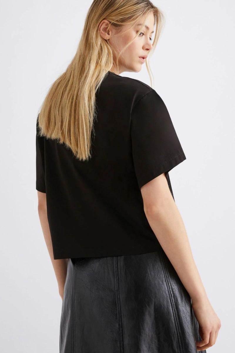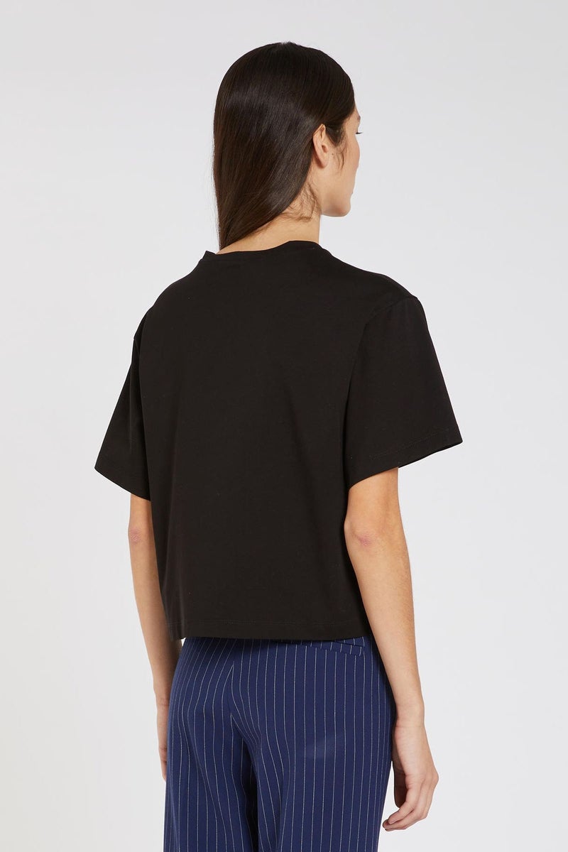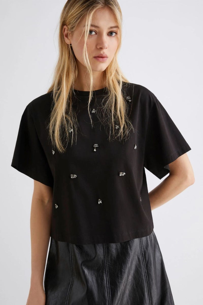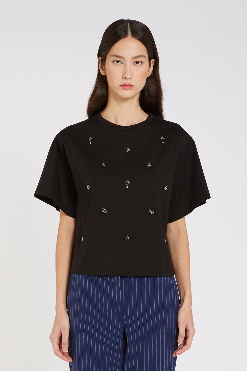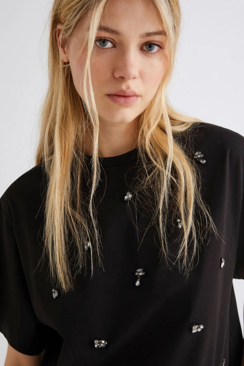 Marella Arnaldo t-paita yhdistää rentouden ja pienen ripauksen glamouria. Lyhyehkö helma ja edessä olevat kristallikoristeet tekevät tästä perusvaatteesta näyttävän valinnan. Pyöreä pääntie ja lyhyet hihat viimeistelevät rennon, mutta tyylikkään ilmeen. Yhdistä t-paita lempifarkkuihin, leveään nahkahameeseen tai bleiserin kanssa tyylikkääseen kokonaisuuteen.