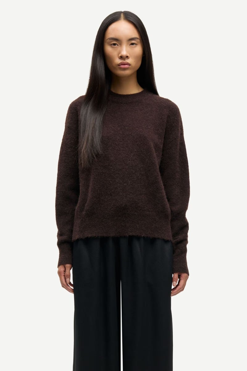 Samsoe & Samsoe Anour ON -neule on arkiklassikko, joka kulkee mukana niin toimistolla kuin viikonloppuretkilläkin. Tummanruskeassa neuleessa on pudotettu hartialinja ja pyöreä nouseva kaulus, jotka luovat rennon ja modernin ilmeen. Neule on valmistettu laadukkaasta alpakka-merinovillasekoitteesta, joka lämmittää ja tuntuu miellyttävältä iholla.