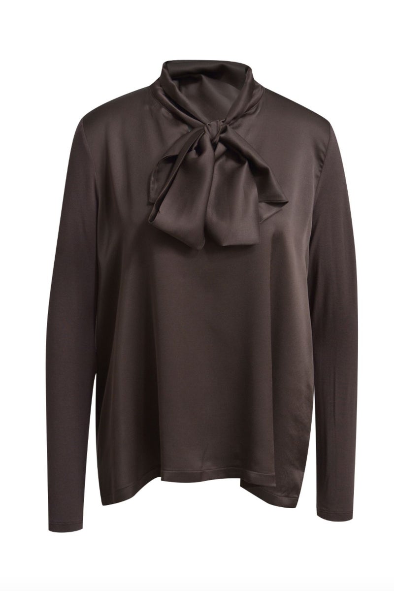 Milano Italyn huivikauluspaita hurmaa ajattomalla tummanruskealla sävyllä ja elegantilla kiillolla. Tummanruskean puseron etupuoli on kevyesti kiiltävää viskoosia, kun taas hihat ja takaosa ovat miellyttävän pehmeää trikoota.