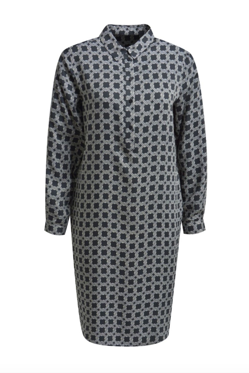 Paitamekossa on klassinen suora malli, kaulukset ja rintaan asti ulottuva nappikiinnitys. Suora leikkaus ja tyylikäs kuviointi luovat mekolle ryhdikkään ilmeen.