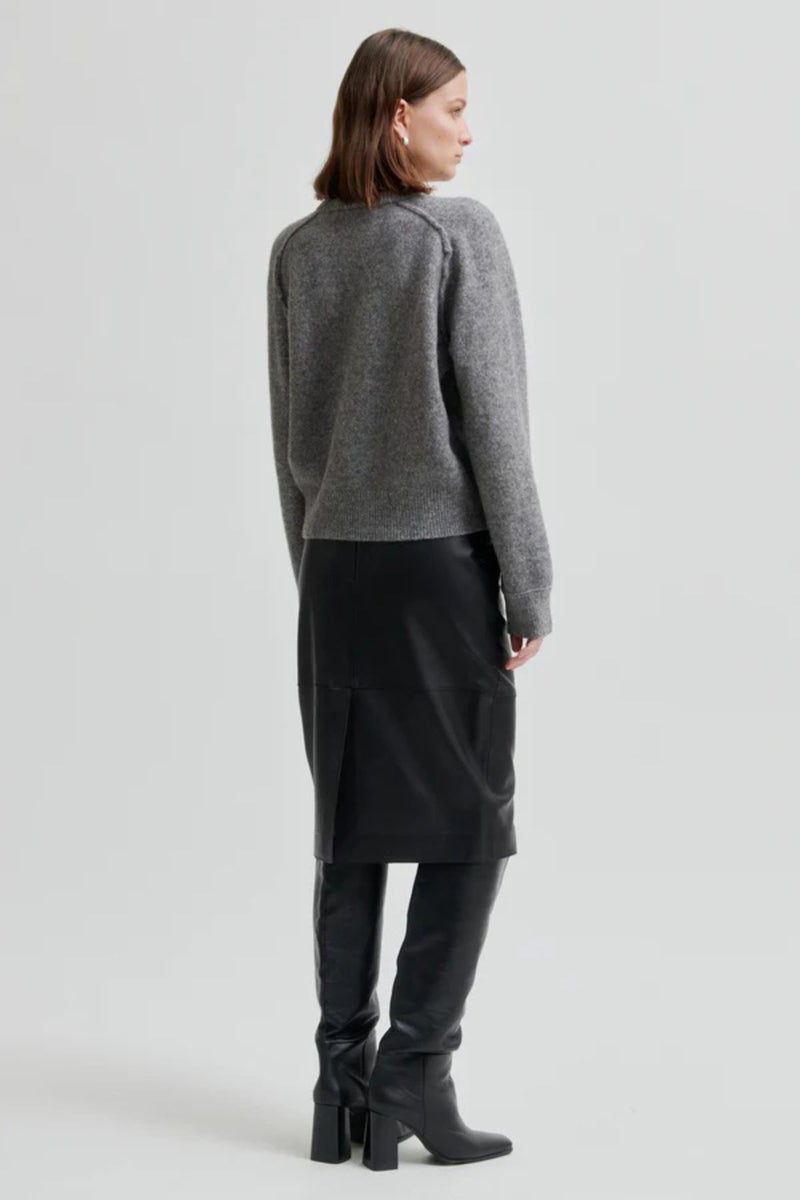 Mustassa nahkahameessa on kapea ja suora leikkaus sekä syvä takahalkio. Hillityt yksityiskohdat – vinoetutaskut, horisontaalinen saumayksityiskohta ja huomaamaton vetoketjukiinnitys – viimeistelevät hienostuneen ilmeen.