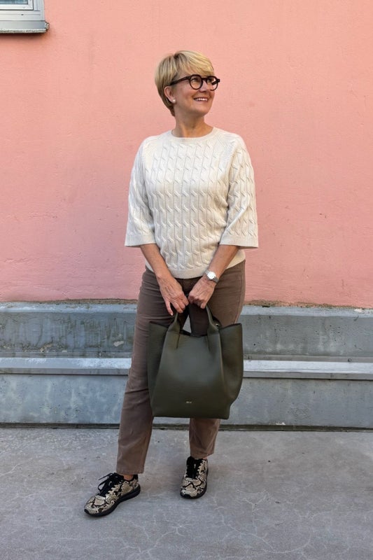 Marella Franz neule yhdistää ylellisen pehmeyden ja ajattoman tyylin. Pehmeä villa-kashmirsekoite tuo neuleeseen hienostuneisuutta, ja puolipitkät raglanhihat tekevät siitä rennon, mutta tyylikkään valinnan arkeen. Suora malli, pyöreä pääntie ja klassinen palmikkoneulekuvio viimeistelevät neuleen ajattoman ilmeen.