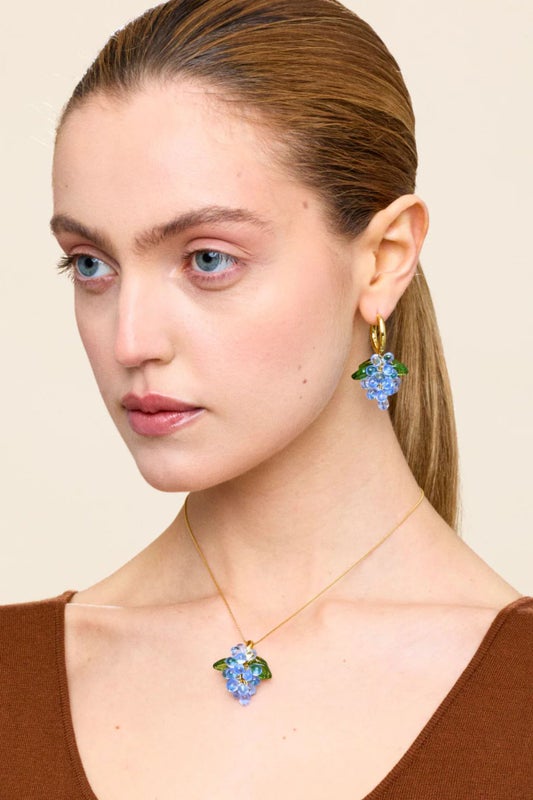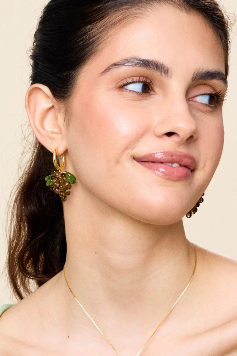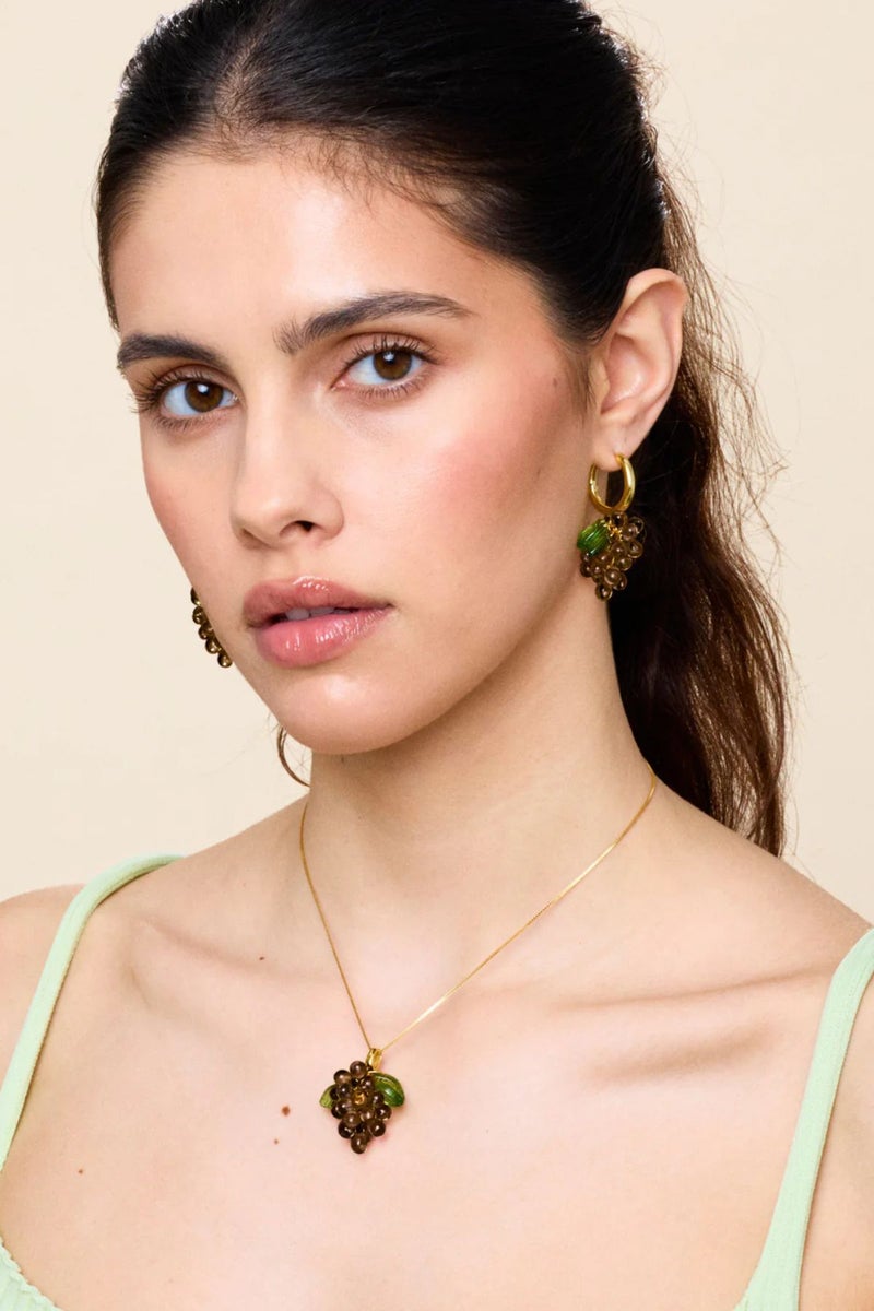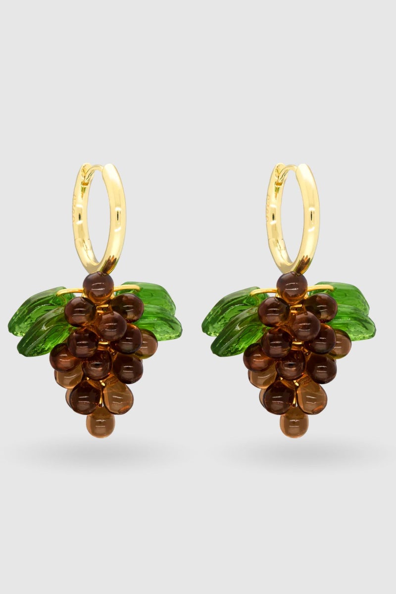Korvakoruissa kimmeltävät suklaanruskeat lasihelmet ja herkät vihreät akryylilehdet. Kullatut sterling-hopearenkaat viimeistelevät korvakorujen laadukkaan ja ajattoman ilmeen.