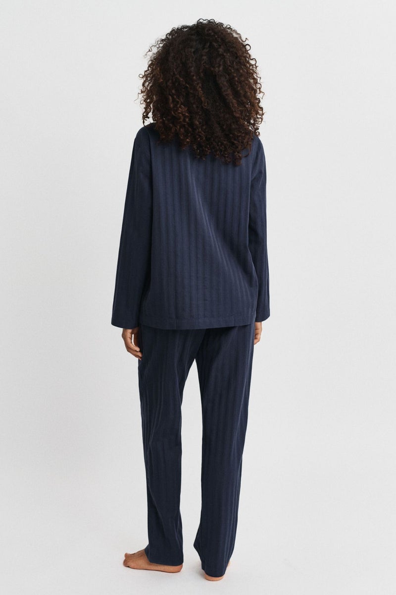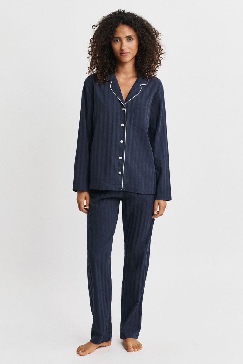 GANTin puuvillasta valmistettuun raidalliseen pyjamaan kuuluu pitkähihainen napitettava pyjamapaita sekä pyjamahousut. Housuissa on sivutaskut ja kiristysnauha vyötäröllä. Paidassa on regular fit ‑mitoitus, kontrastivärinen tere kauluksessa sekä rintatasku, johon on kirjailtu GANT-logo. Sekä ylä- että alaosassa on kudottu satiininen raitakuosi.