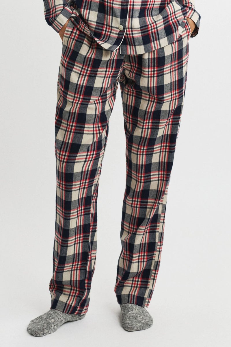 GANTin puuvillasta valmistettuun pehmeään pyjamaan kuuluu pitkähihainen napitettava pyjamapaita sekä pyjamahousut. Housuissa on sivutaskut ja kiristysnauha vyötäröllä. Paidassa on regular fit ‑mitoitus, kontrastivärinen tere kauluksessa sekä rintatasku, johon on kirjailtu GANT-logo. Sekä ylä- että alaosassa on flanelliruutukuosi.