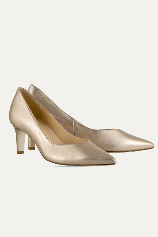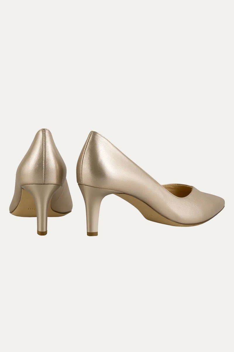 Kiiltävissä pronssinvärisissä avokkaissa on hengittävä nahkavuori, ja 6,5 cm korkea korko kohottaa niin asua kuin askelia. Liukumaton kumipohja varmistaa, että askel pysyy varmana säässä kuin säässä.