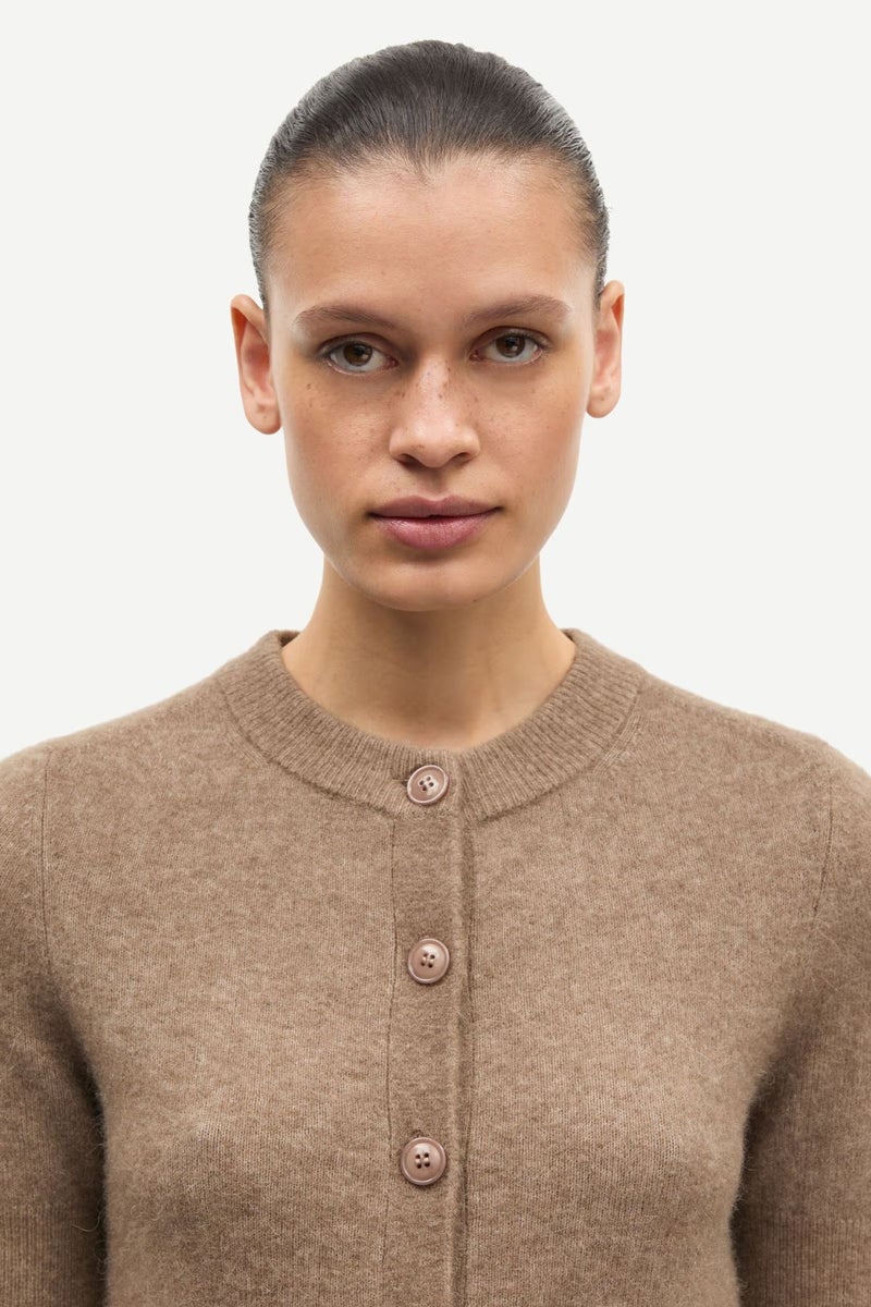 Samsoe Samsoen vaaleanruskeassa neuletakissa on pyöreä pääntie, lyhyet hihat ja nappikiinnitys edessä. Ribbineulotut yksityiskohdat kauluksessa, hihansuissa ja helman alareunassa tuovat kauniin viimeistelyn.