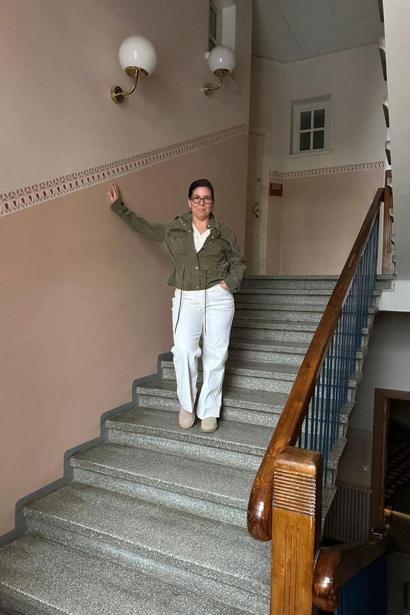 - Malli on 156 cm pitkä ja käyttää kokoa 40.