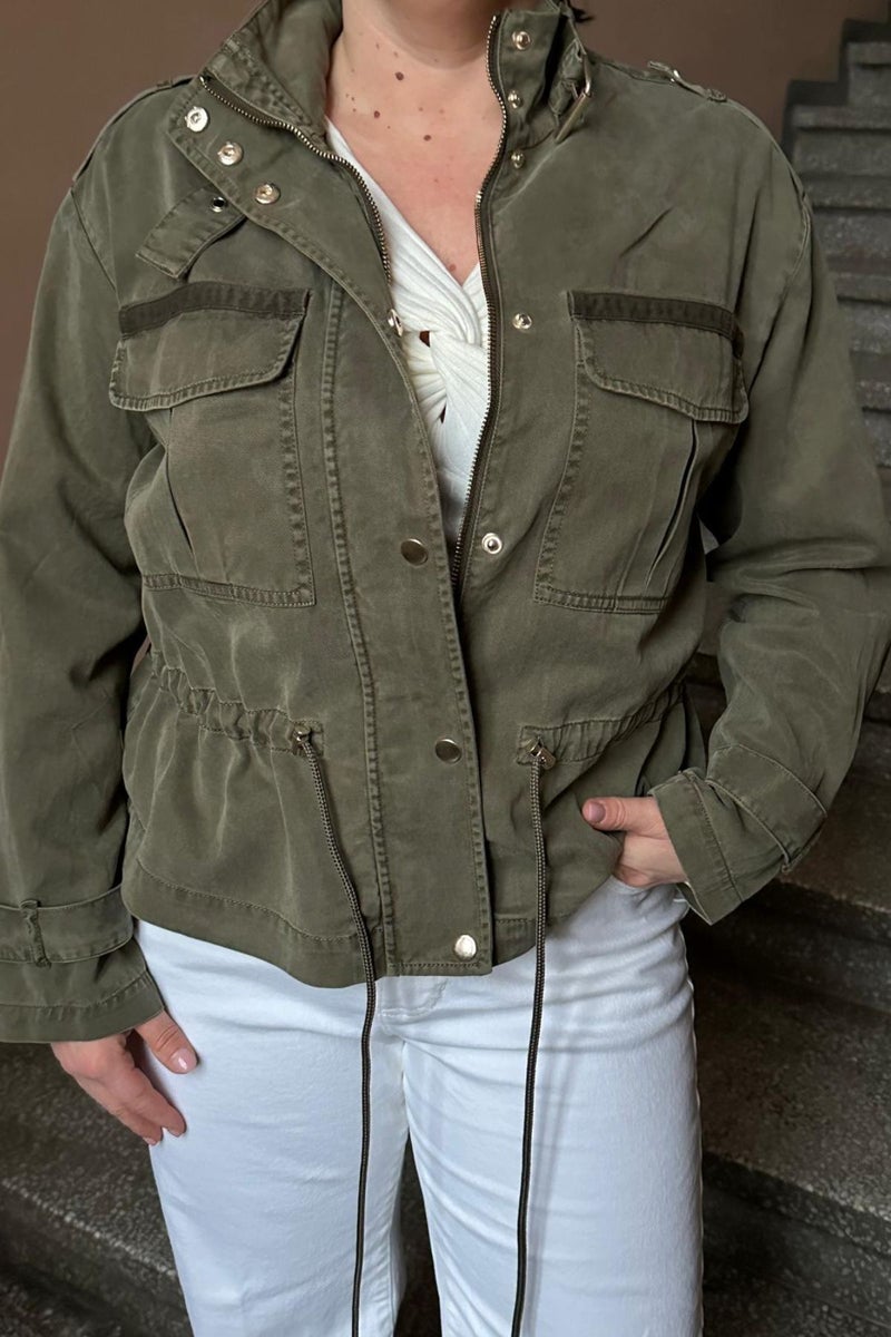 Khakinvihreä paitatakki on valmistettu ohuesta ja sileästä puuvillasekoitteesta, joka laskeutuu kauniisti ja tuntuu ylellisen kevyeltä päällä. Vihreä väri toimii loistavasti neutraalien sävyjen kanssa, mutta yhdistyy vaivattomasti myös rohkeampiin väreihin.