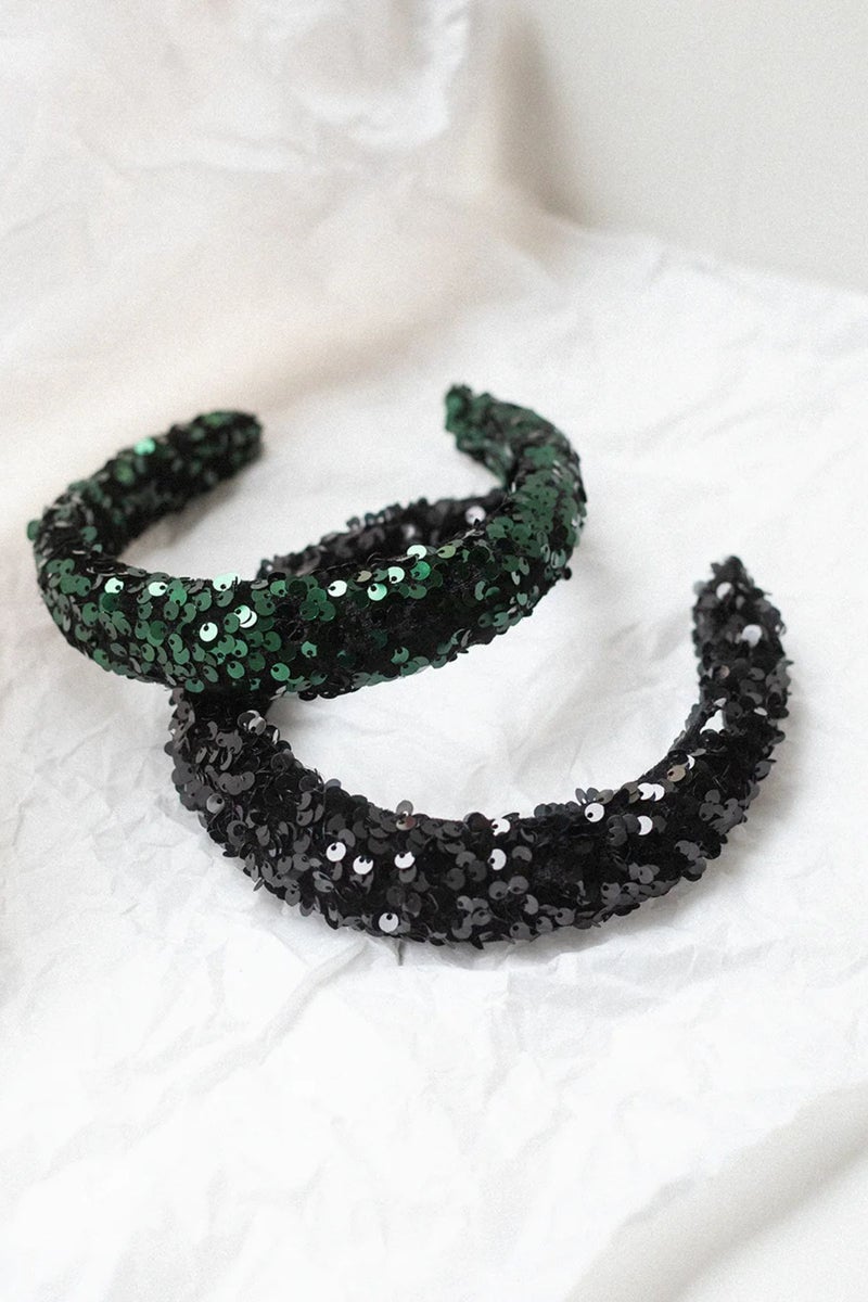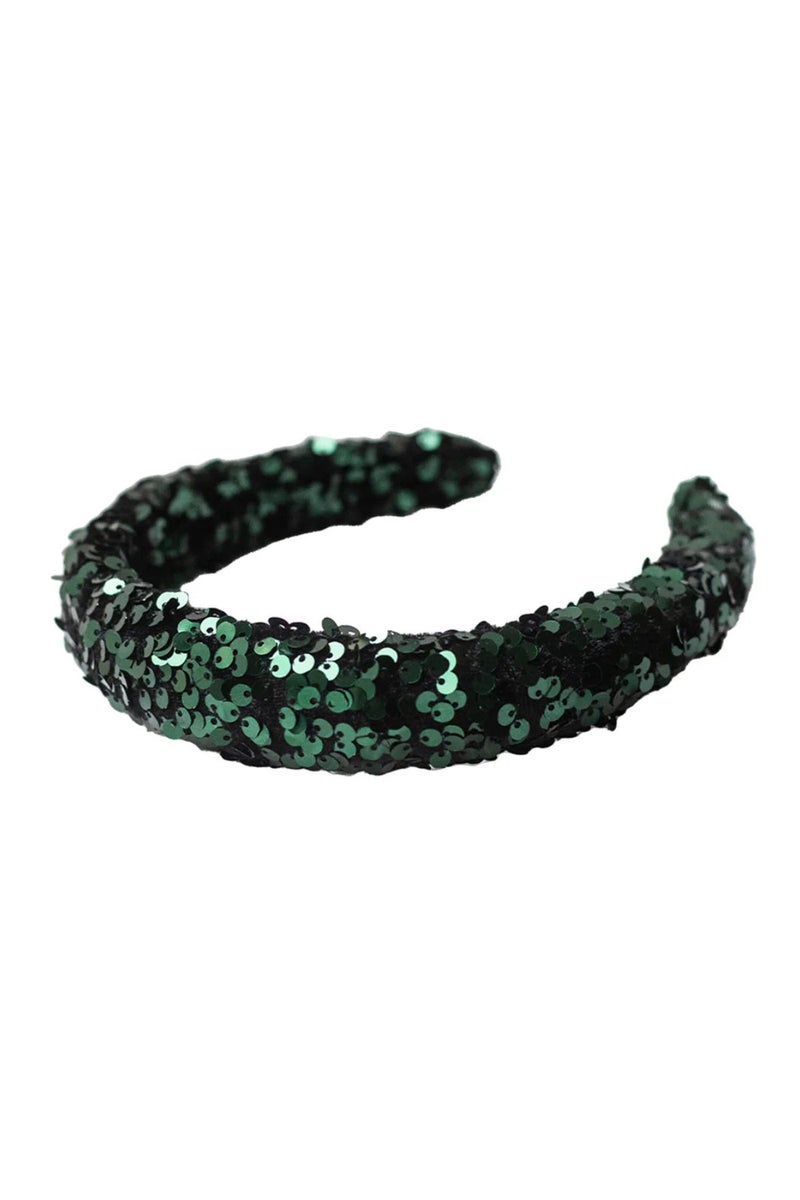 Gauharin hiuspanta on tehty kruunaamaan juhla-asusi. Kimaltavat vihreät paljetit koristelevat hieman topattua hiuspantaa. Hiuspanta on valmistettu Helsingissä.