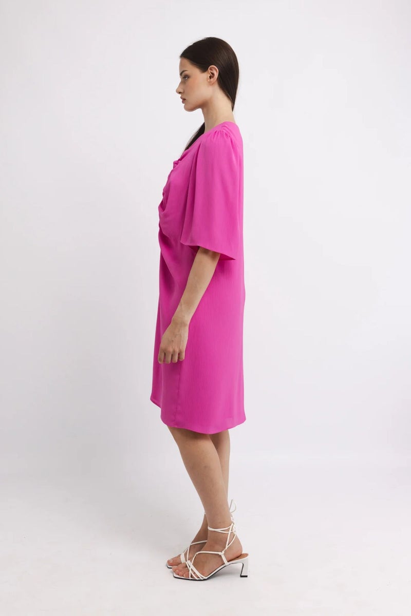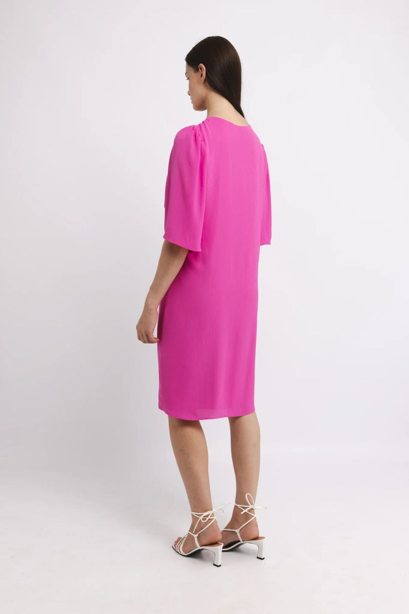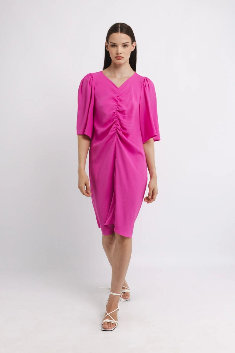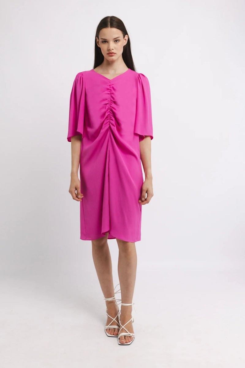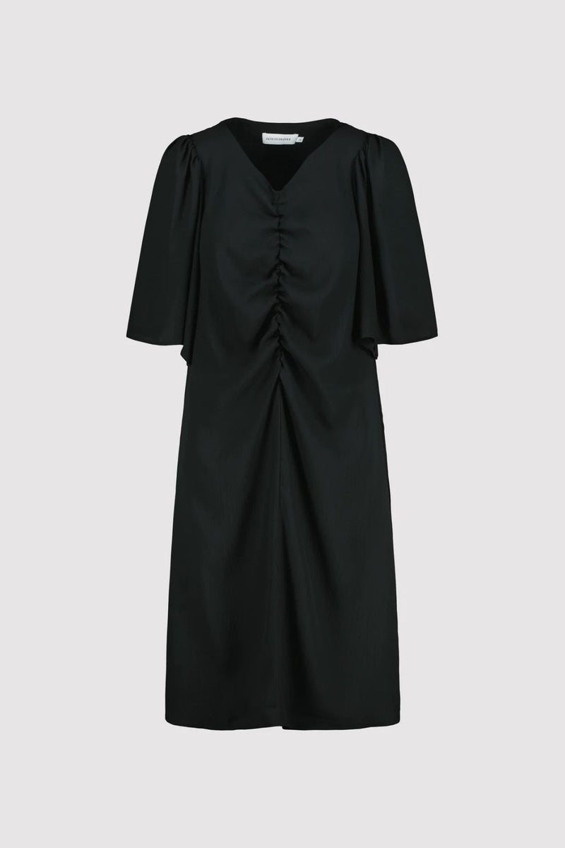 KATRI NISKANEN Usma mekko on modernin naisellinen valinta, jossa harkittu muotoilu kohtaa kevyen liikkeen. Kevyestä, mutta ryhdikkäästä satiinista valmistettu mekko laskeutuu kauniisti ja tuo asuun hienostunutta ilmettä. Mustassa mekossa on v-pääntie, kauniisti rypytetty ja vuoritettu yläosa sekä ilmavat ja vajaamittaiset hihat.