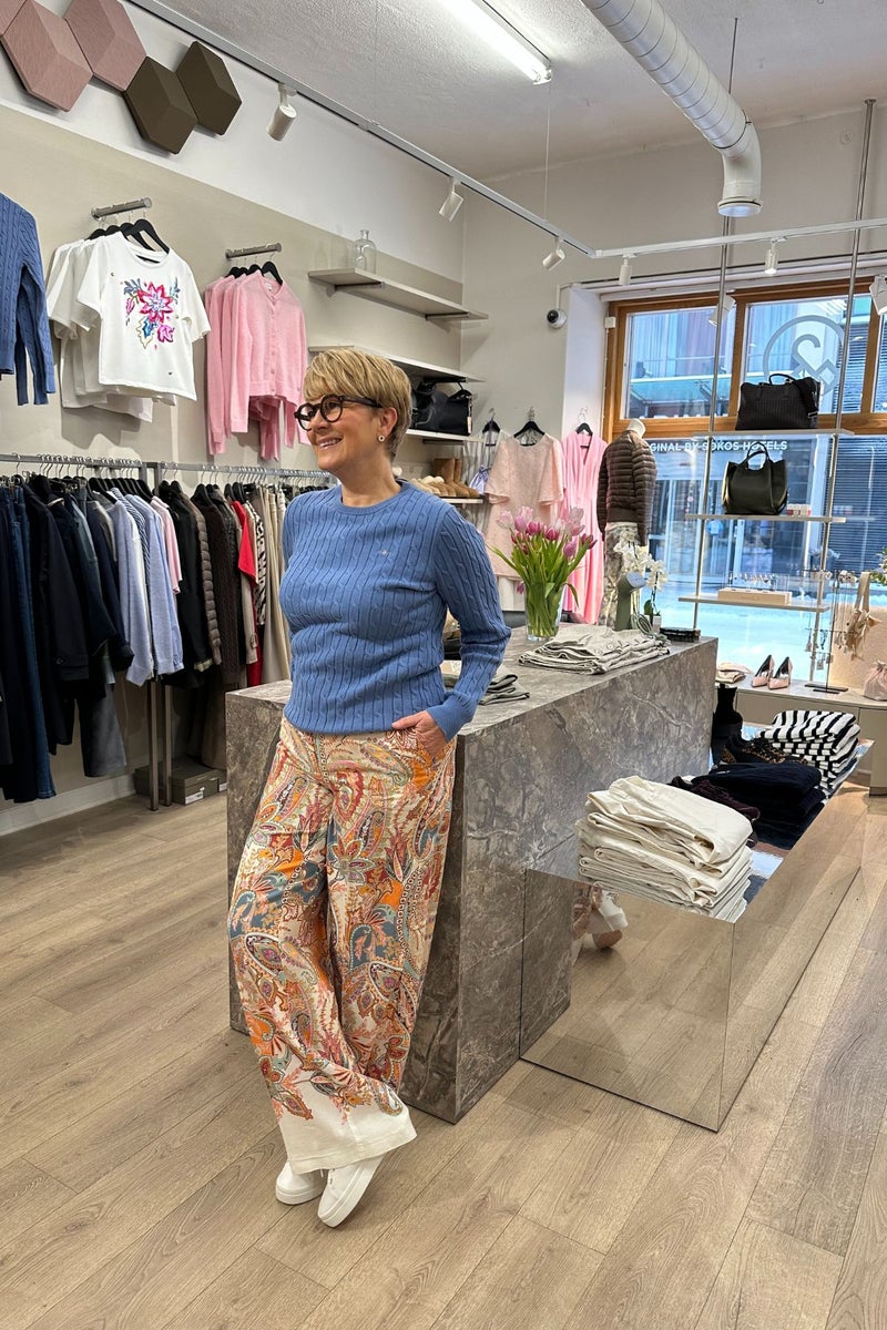 Cambio Adrienne housut hurmaavat näyttävällä ja värikkäällä paisleykuviolla. Täyspitkä, leveälahkeinen malli luo modernin ja ilmavan ilmeen. Housut on valmistettu laadukkaasta ja kevyesti laskeutuvasta lyoselli-pellavasekoitteesta, joka tuntuu miellyttävältä ihoa vasten.