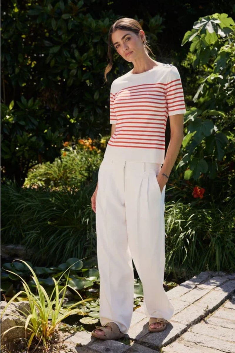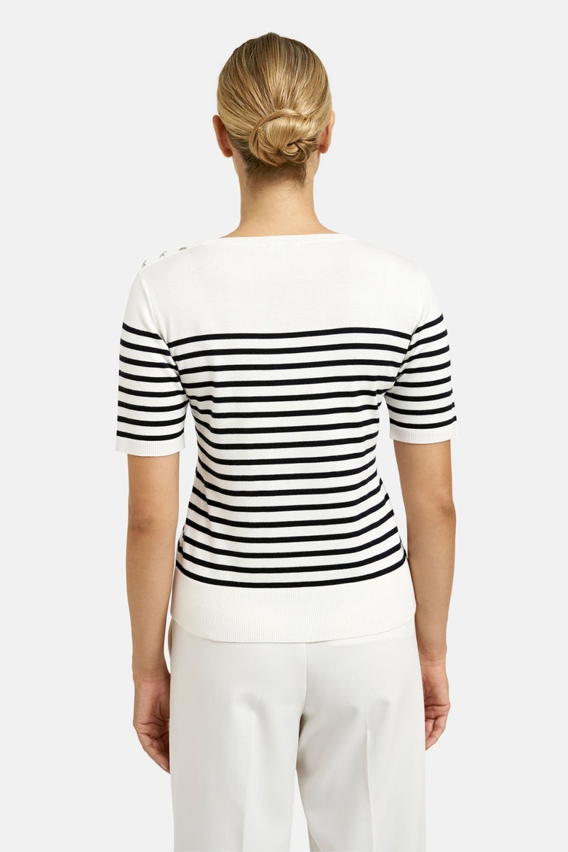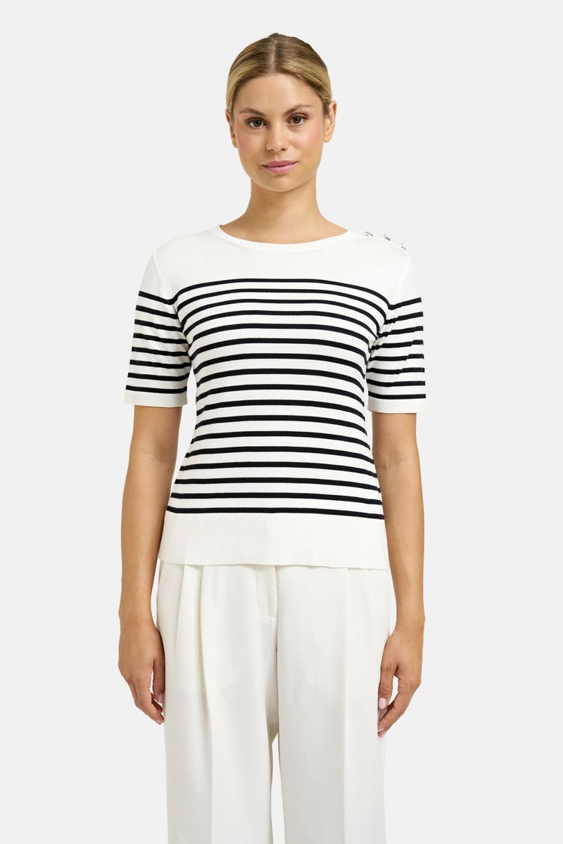 Milano Italy raitaneule on vaatekaapin monikäyttöinen luottovaate. Valkoista pohjaa rytmittävät punaiset raidat tuovat raikkaan ilmeen, ja lyhyet hihat tekevät neuleesta kevyen ja monikäyttöisen ympäri vuoden. Hopeanväriset koristenapit toisella olkapäällä viimeistelevät ilmeen.