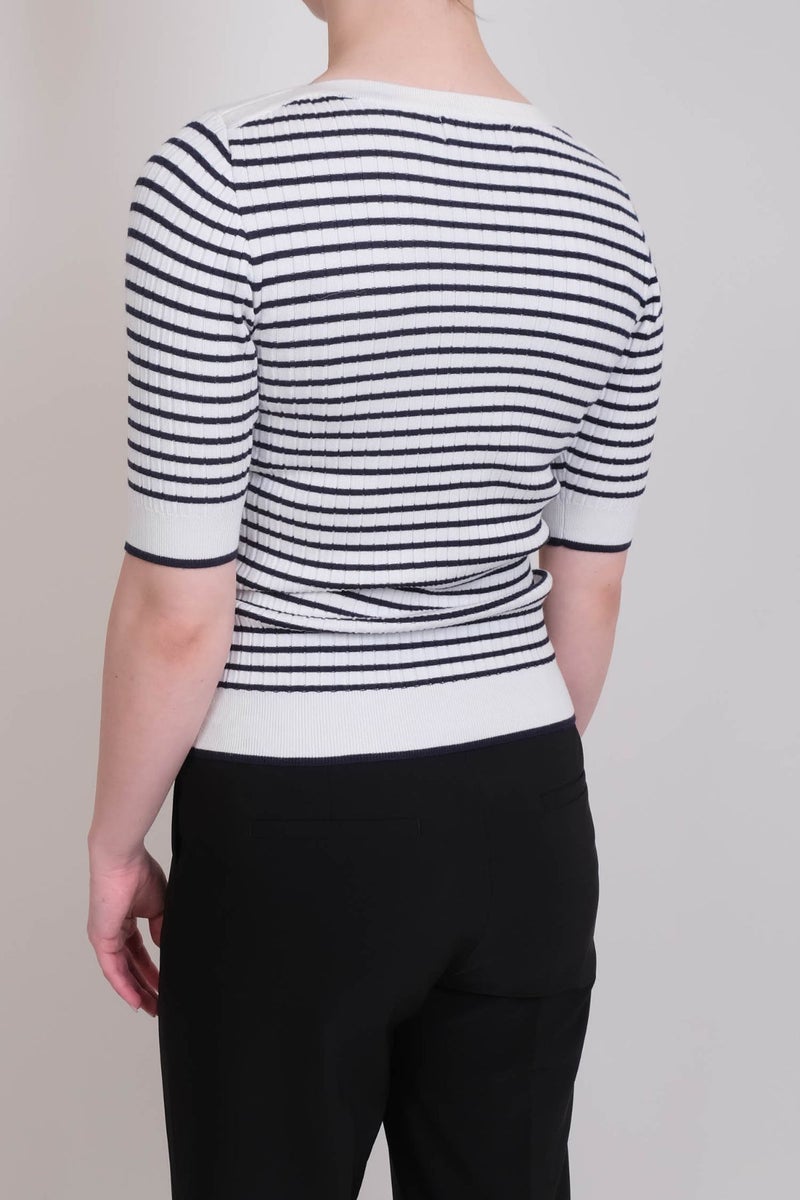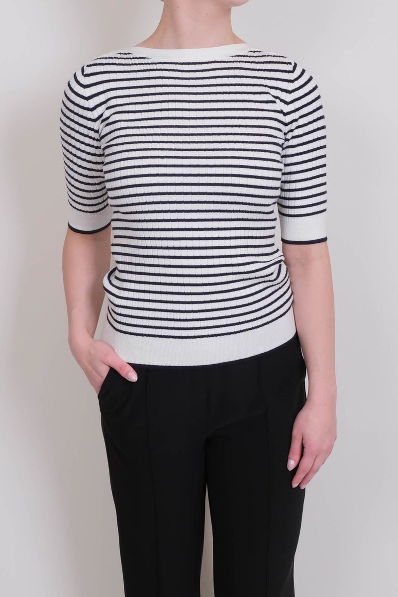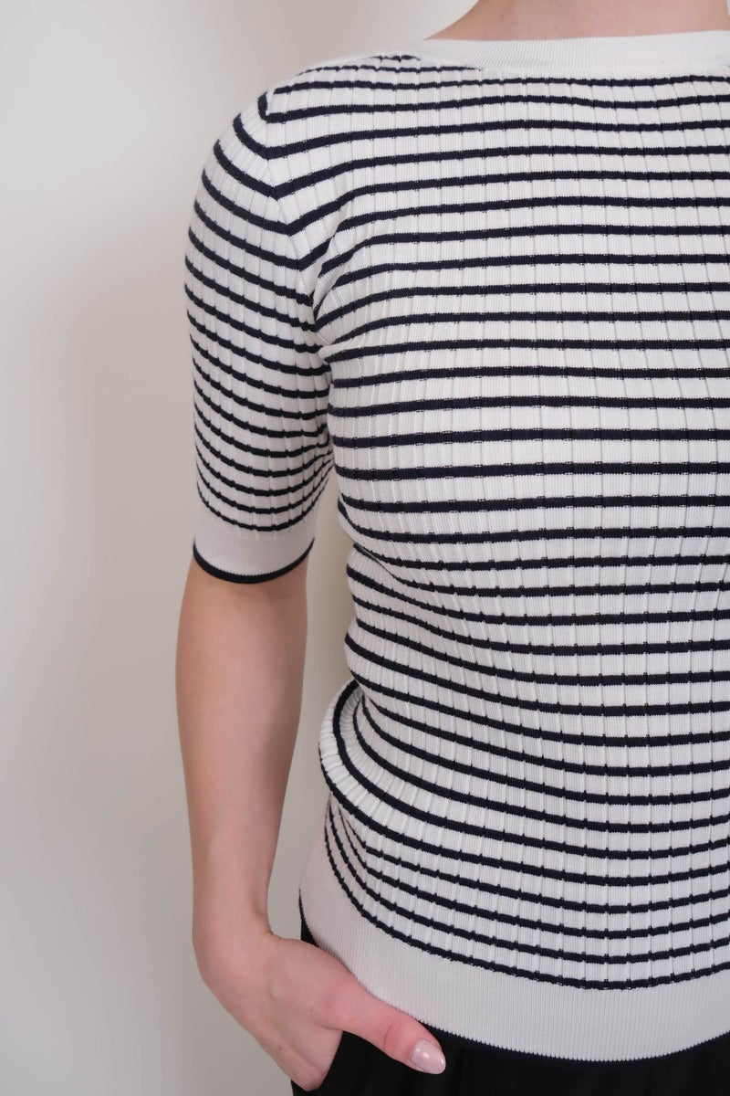 Andiata Kasandra raitaneule on tuo ranskalaisen chicin osaksi arkipukeutumista. Klassinen raitakuosi, tyköistuva malli ja elegantti venepääntie tekevät neuleesta monikäyttöisen luottovaatteen, joka toimii sekä kesäisissä asuissa että kerrospukeutumisessa ympäri vuoden. Kauniisti strukturoitu ribbineulos istuu imartelevasti ja tuntuu miellyttävältä päällä.