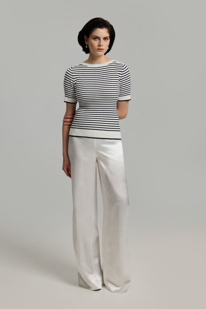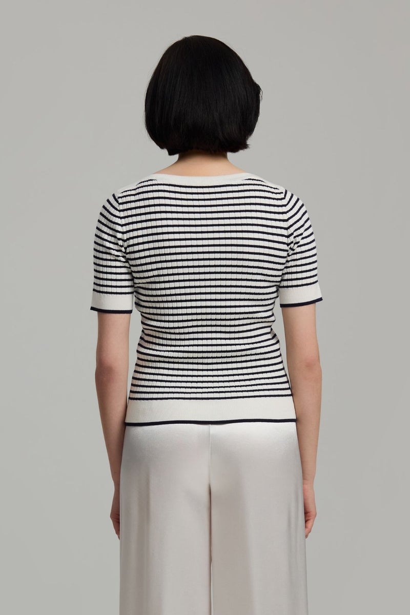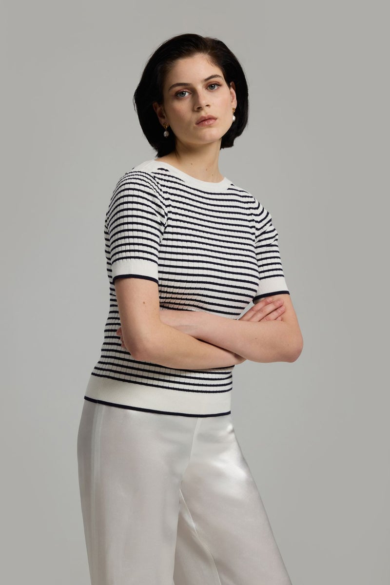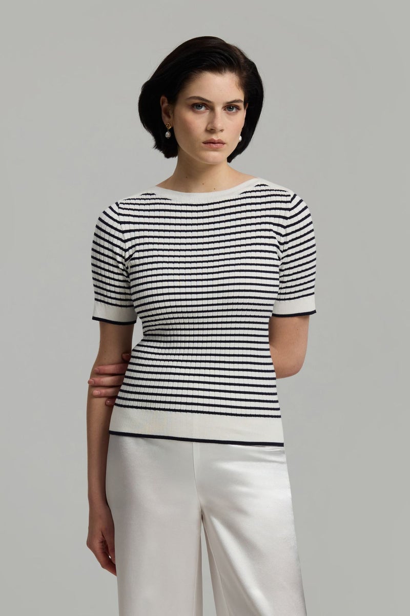 Andiata Kasandra raitaneule on tuo ranskalaisen chicin osaksi arkipukeutumista. Klassinen raitakuosi, tyköistuva malli ja elegantti venepääntie tekevät neuleesta monikäyttöisen luottovaatteen, joka toimii sekä kesäisissä asuissa että kerrospukeutumisessa ympäri vuoden. Kauniisti strukturoitu ribbineulos istuu imartelevasti ja tuntuu miellyttävältä päällä.