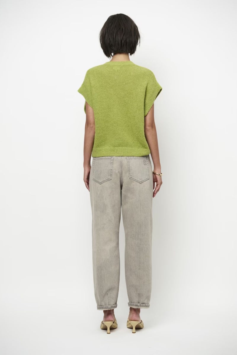 Rennon mallinen neuletakki on suunniteltu pudotetuilla olkapäillä ja lyhyillä hihoilla. Syvä v-pääntie, nappikiinnitys ja rinnassa oleva pieni logoyksityiskohta viimeistelevät ilmeen.