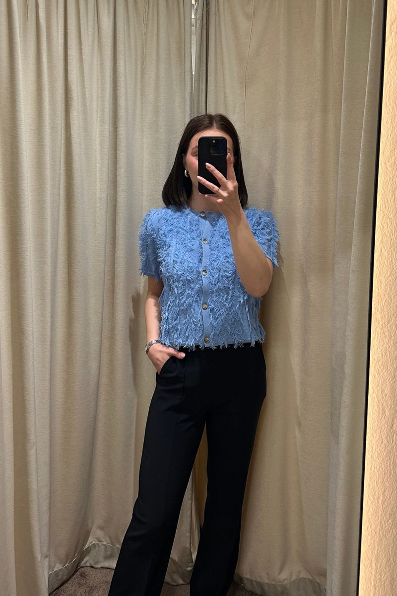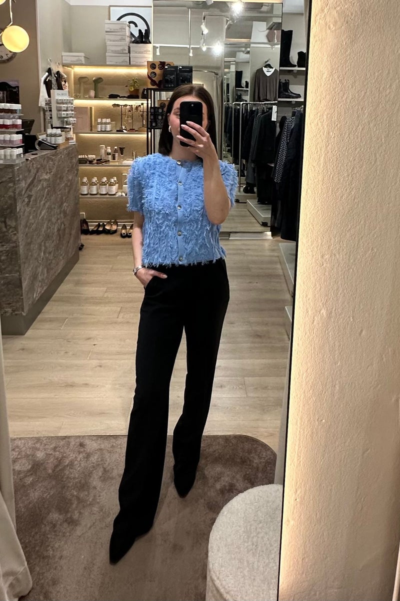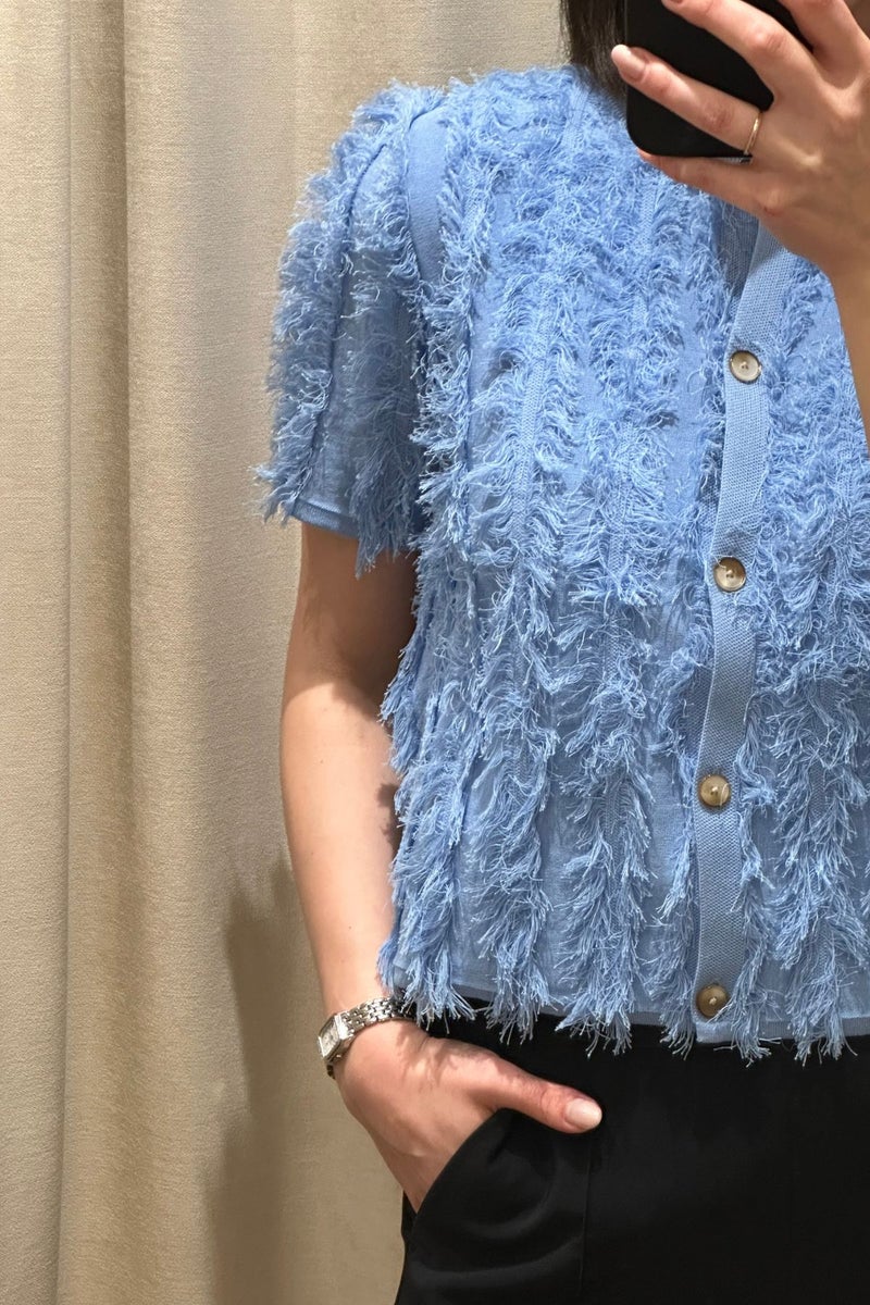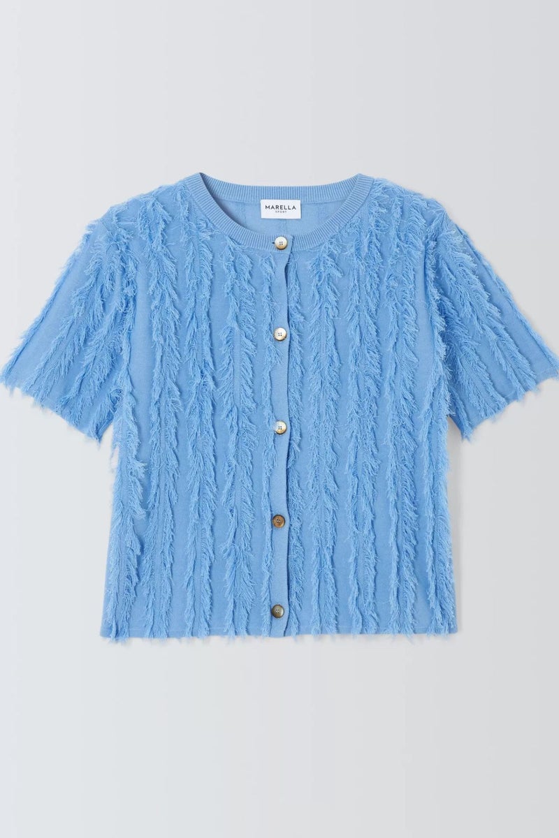 Marella Spaggio neuletakki tuo asuun raikasta väriä ja kiinnostavaa tekstuuria. Kaunis taivaansininen sävy yhdistettynä hapsuyksityiskohtiin tekee neuletakista näyttävän mutta helposti yhdisteltävän. Lyhyet hihat ja kevyesti laskeutuva puuvillaneulos sopii kerrospukeutumiseen ympäri vuoden.