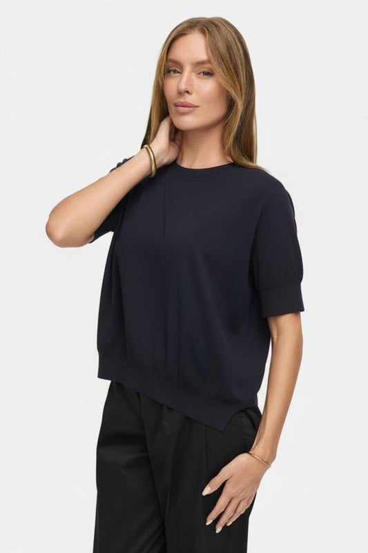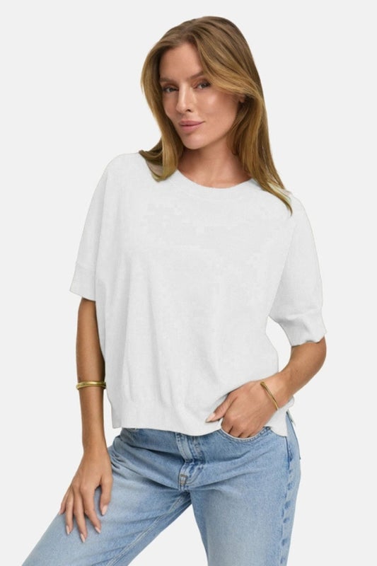 Laatikkomallinen leikkaus tuo neuleeseen ilmavuutta ja modernia siluettia, ja lyhyet hihat tekevät siitä miellyttävän myös lämpimämpiin päiviin. Klassinen pyöreä pääntie sekä resorit hihansuissa ja helmassa viimeistelevät huolitellun ilmeen.