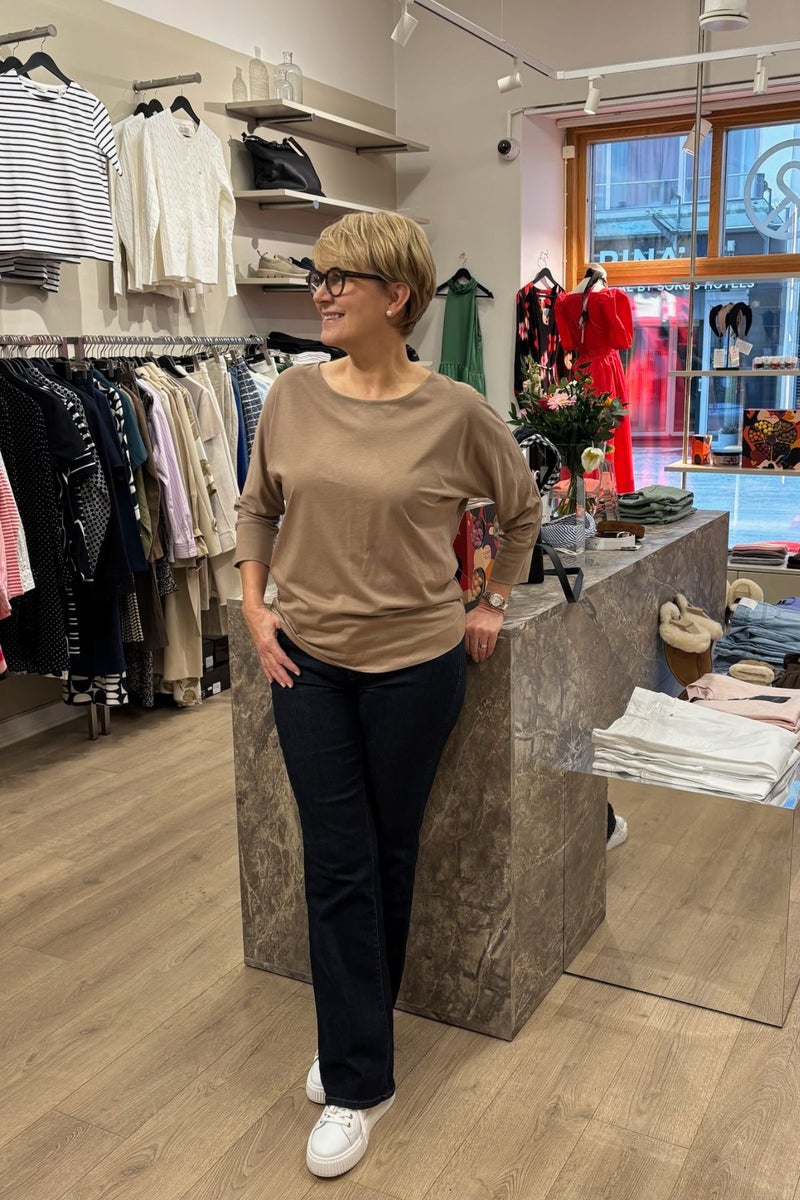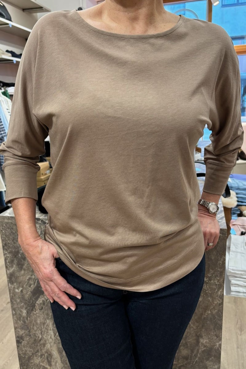 Repeatin vaaleanruskeassa puserossa on venepääntie, vajaamittaiset lepakkohihat ja pyöristetty helma.