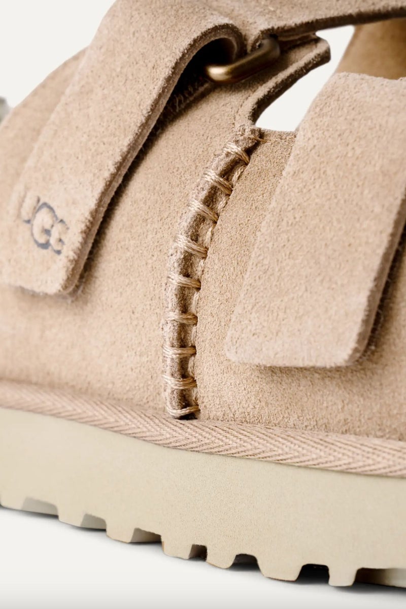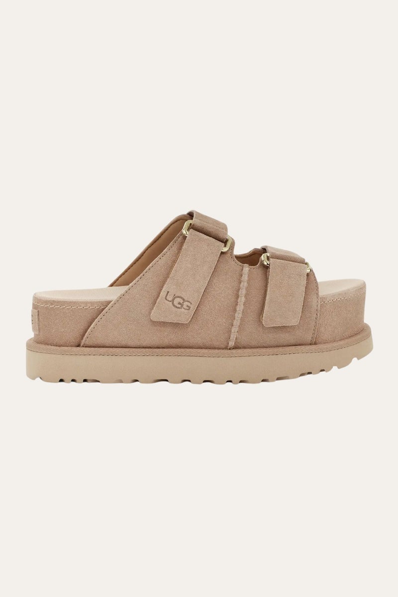 UGG Goldenstar Hi Slide on suunniteltu kestämään kiireisen arjen ja rennot kesäpäivät. Klassinen hiekan sävy ja UGGin tunnistettavat yksityiskohdat tekevät sandaaleista vaatekaapin luottoparin, jota on helppo yhdistellä niin farkkujen, mekkojen kuin rentojen loungewear-asujen kanssa.