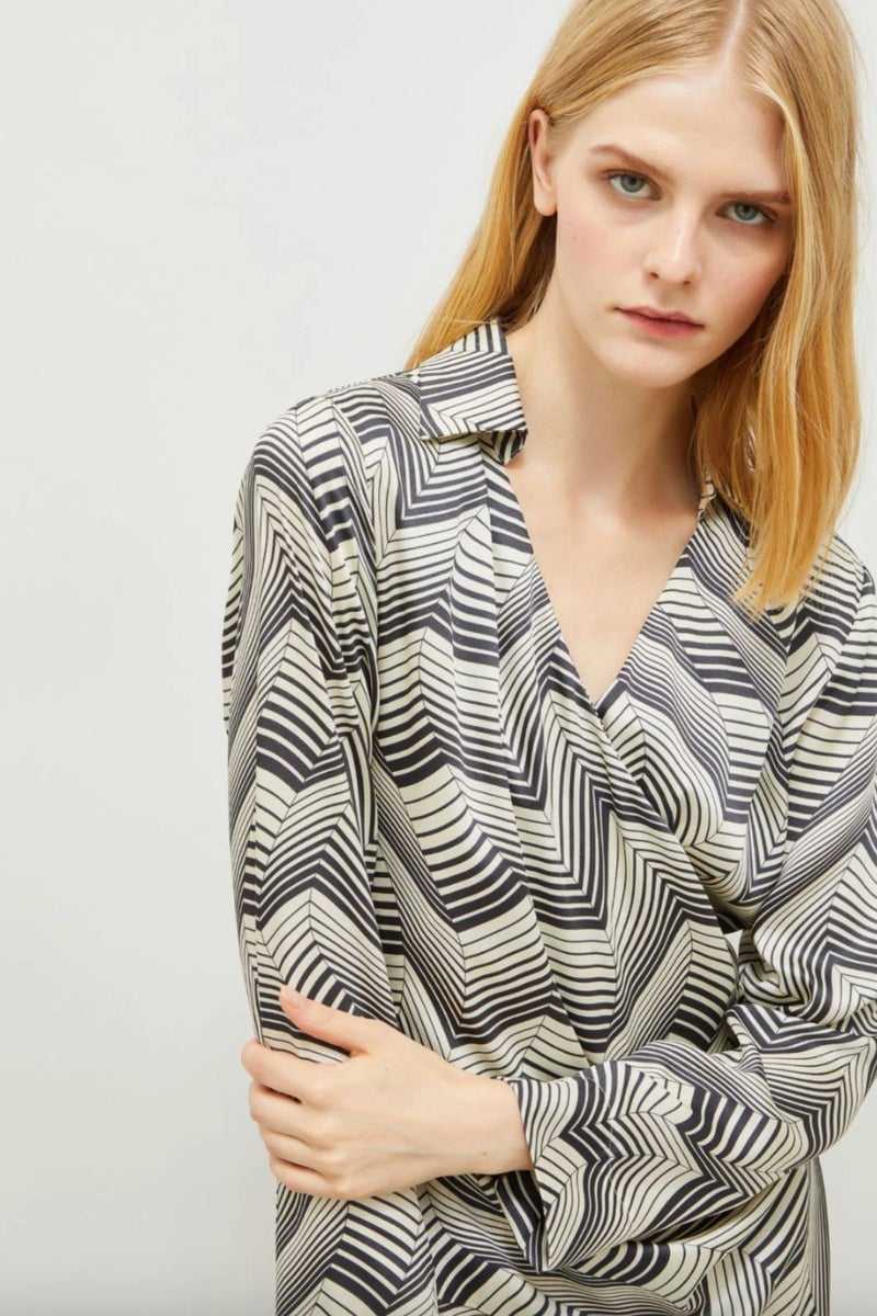 Ohut ja liukas, kierrätetystä polyesterista valmistettu kangas laskeutuu kauniisti ja pitää olon mukavana koko päivän. Rennon naisellinen istuvuus, kaulukset ja vyötäröltä rypytetty leikkaus tuovat ryhdikkyyttä ja persoonallisuutta lookiin.
